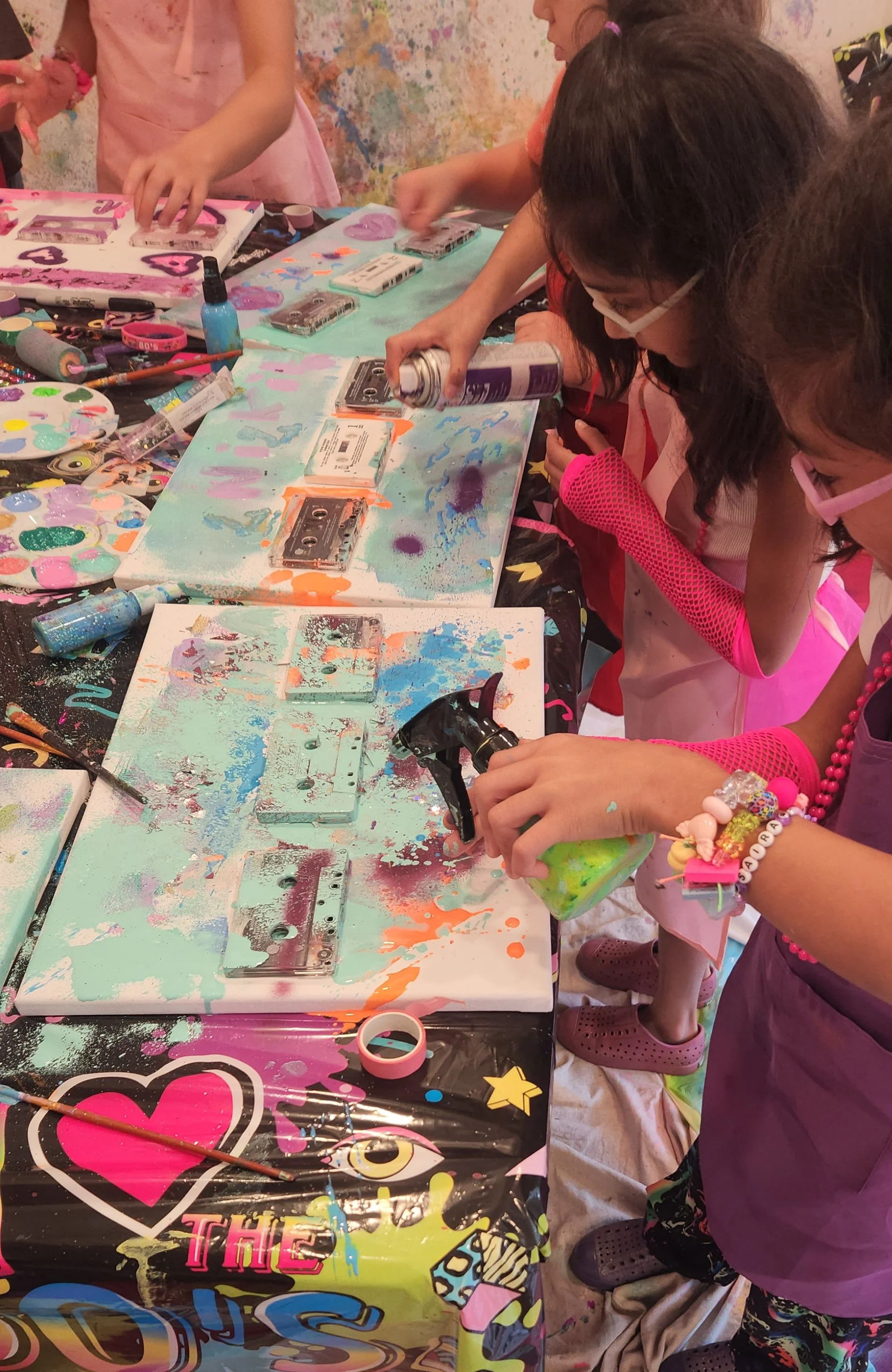 Scrap paper collage, large canvases and spray/splatter paint. $650/12 ppl, $25 each additional person.