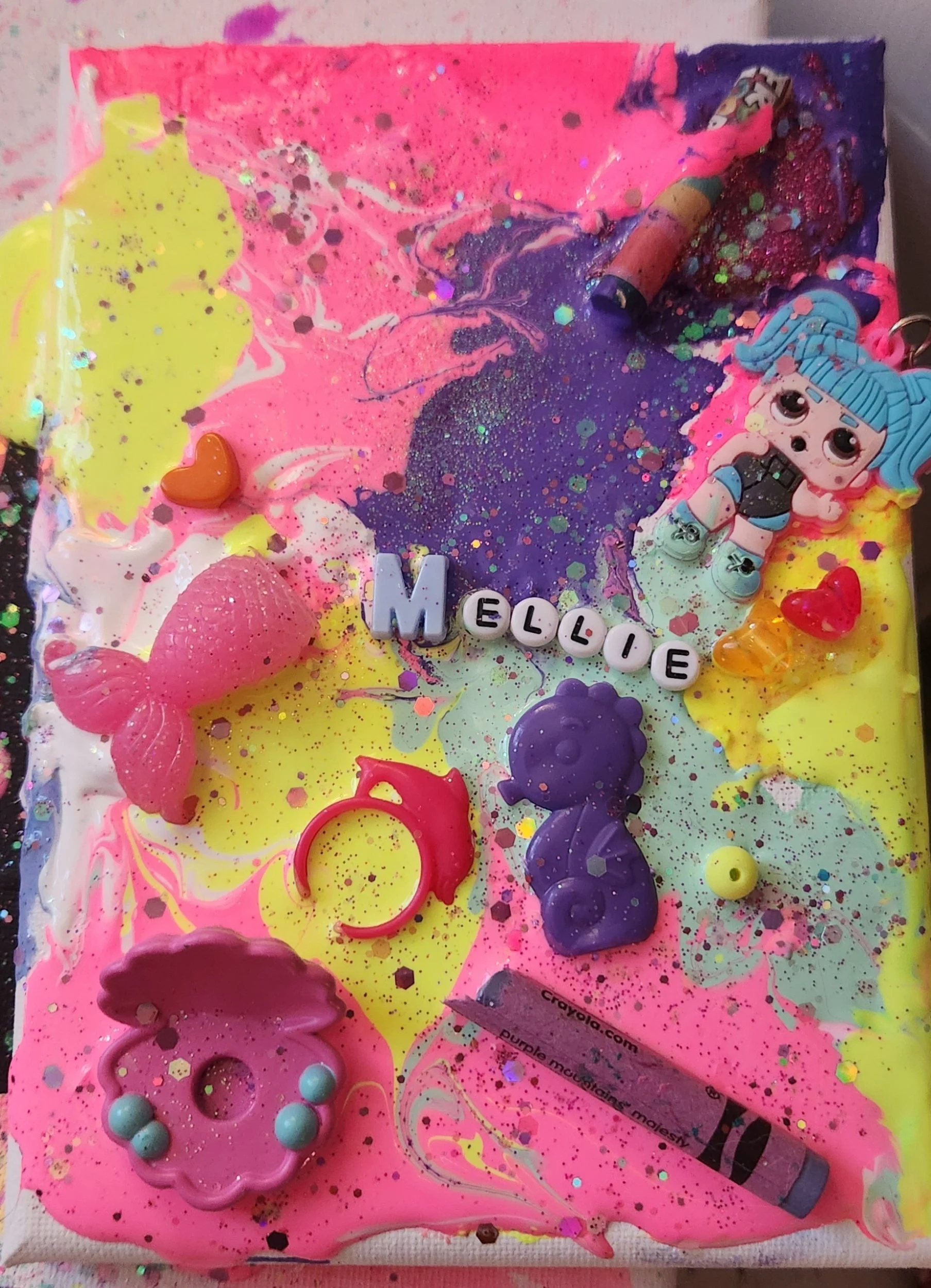 *8×10 canvases with charm and toy bar to add in, glitter and sequins